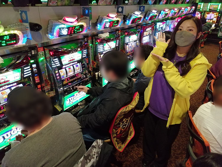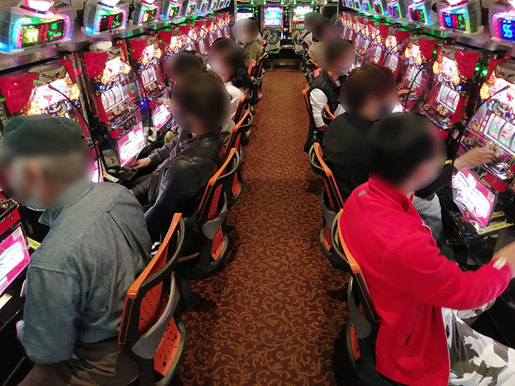 この日の抽選結果はなんと…最後尾!! 店内に入った時には新台のハッピージャグラーV3や番長ZERO、バジリスク絆2といった人気機種はもちろん埋まっていました。