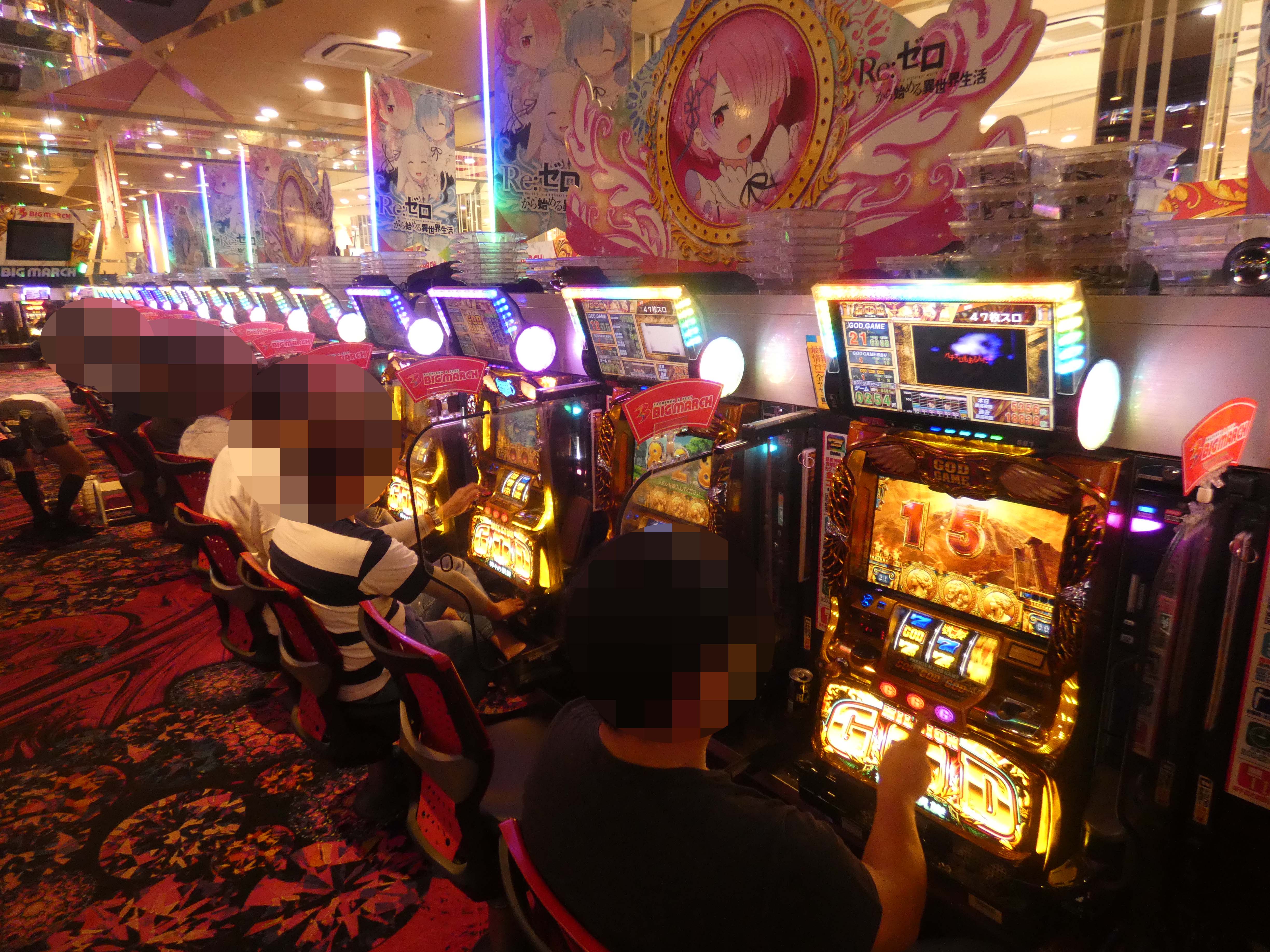 機種単位ではミリオンゴッド凱旋、バジリスク絆あたりが人気。特に凱旋は1列ずらーっと設置台数がかなり多いにもかかわらず、朝からずっと空き台を見つけるのが難しい状況。