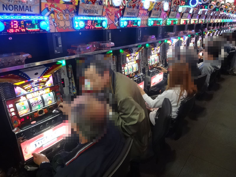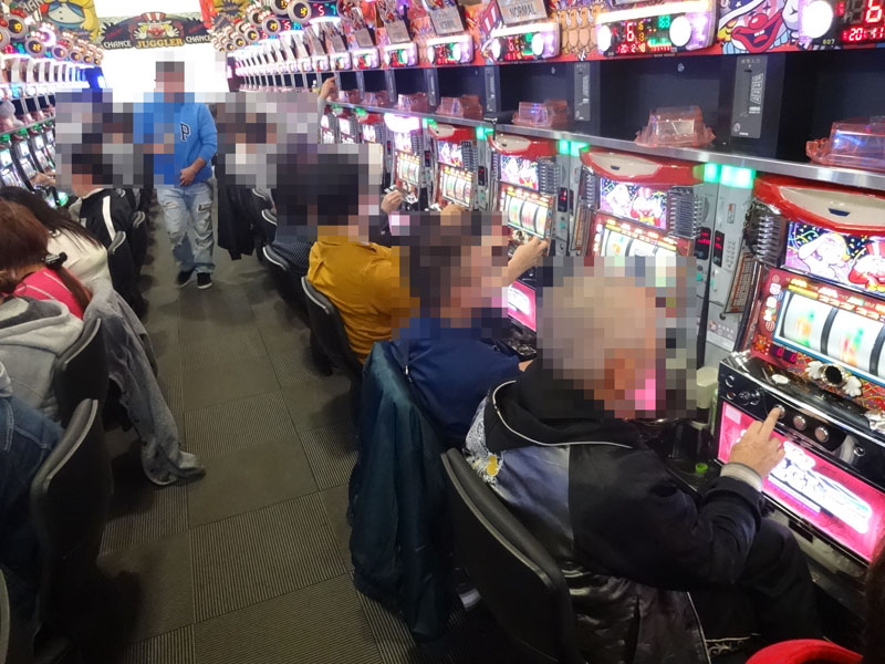 この日もっとも注目したのが複数の機種を取り揃えている『ジャグラー』コーナー。もっとも設置台数の多い『アイムジャグラーEX-AE』だけでなく、あらゆる台に1000〜2000ptの台が確認できる状況。当然のことながら各台ともほぼフル稼働で盛り上がっていました。