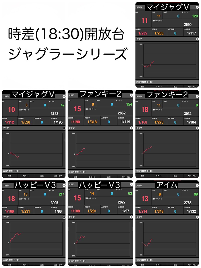 ちなみに自分が打ったスマスロ北斗はこの末尾対象でもないのに設定6が確定しておりまして。つまりは対象末尾とは関係ないところにも高設定が至るとことに存在していたんですよね。そんな訳で特に強かった機種をいくつかピックアップ!ピックアップ機種 平均pt数 平均ゲーム数 平均PAYOUT 機種名 プラス台数 725pt 6,746G 103.6% Lパチスロ北斗の拳AD XR 44/90 585pt 6,567G 103.0% SマイジャグラーV KD 47/71 315pt 6,968G 101.5% Sパチスロ甲鉄城のカバネリZR 23/43 285pt 6,604G 101.4% L革命機ヴァルヴレイヴD 9/23 2,275pt 6,276G 112.1% L 主役は銭形4 L1 8/12 ポイントTOP5順位 機種名(台番号) pt数 1 L主役は銭形4L1(1018) 18,042pt 2 L革命機ヴァルヴレイヴD(925) 14,517pt 3 L パチスロ北斗の拳AD XR(1094) 13,855pt 4 L革命機ヴァルヴレイヴD(918) 10,835pt 5 L パチスロ北斗の拳AD XR(879) 9,652pt 更にこの日は18:30から打てる「時差開放台」も存在しておりまして。短時間しか打てないながらしっかりと反応していたので、そのグラフも全台ご紹介!