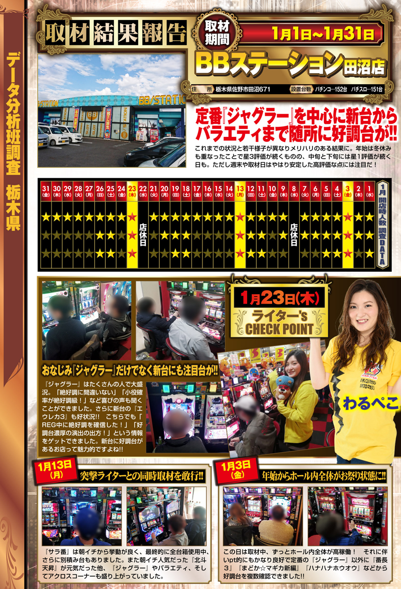 2020/1/1(水)〜1/31(金)【データ分析班調査】1月は「突撃ライター取材」との同時取材も敢行!『ジャグラー』はもちろん大盛況、『エウレカ3』『まどかマギカ新編』などにも好状況を発見!