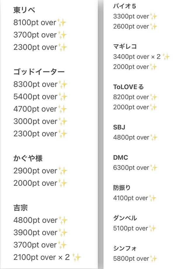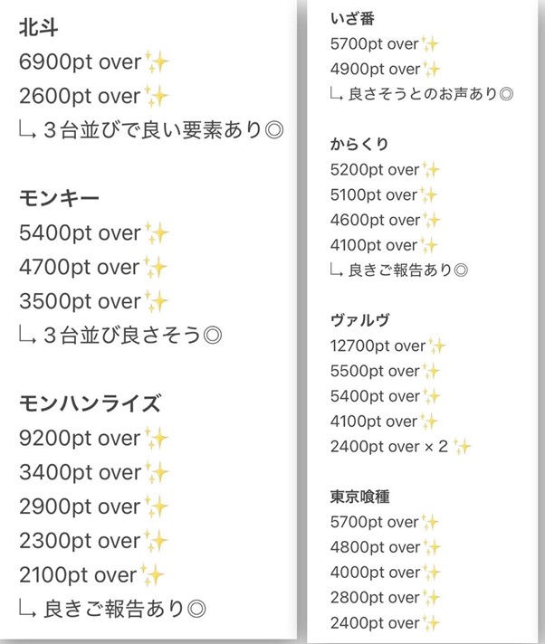 L吉宗ピックアップ機種@ 全7台中5台がプラス! 平均pt 1,911pt 平均ゲーム数 5,852G 平均PAYOUT 110.9% 沖ドキ!GOLDピックアップ機種A 全34台中19台がプラス! 平均pt 272pt 平均ゲーム数 5,786G 平均PAYOUT 101.6% ファンキージャグラー2ピックアップ機種B 全9台中5台がプラス! 平均pt 414pt 平均ゲーム数 5,994G 平均PAYOUT 102.3% ジャグラーガールズピックアップ機種C 全4台中3台がプラス! 平均pt 728pt 平均ゲーム数 7,032G 平均PAYOUT 103.5% ハッピージャグラーVIIIピックアップ機種D 全4台中3台がプラス! 平均pt 2,188pt 平均ゲーム数 7,109G 平均PAYOUT 110.3% ポイントTOP5順位 機種名(台番号) pt数 1 L革命機ヴァルヴレイヴ(770) 9,937pt 2 L七つの魔剣が支配する(1260) 8,016pt 3 Lモンスターハンターライズ(1028) 7,496pt 4 Lパチスロゴッドイーターリザレクション(812) 6,741pt 5 Lパチスロ北斗の拳(1003) 6,688pt