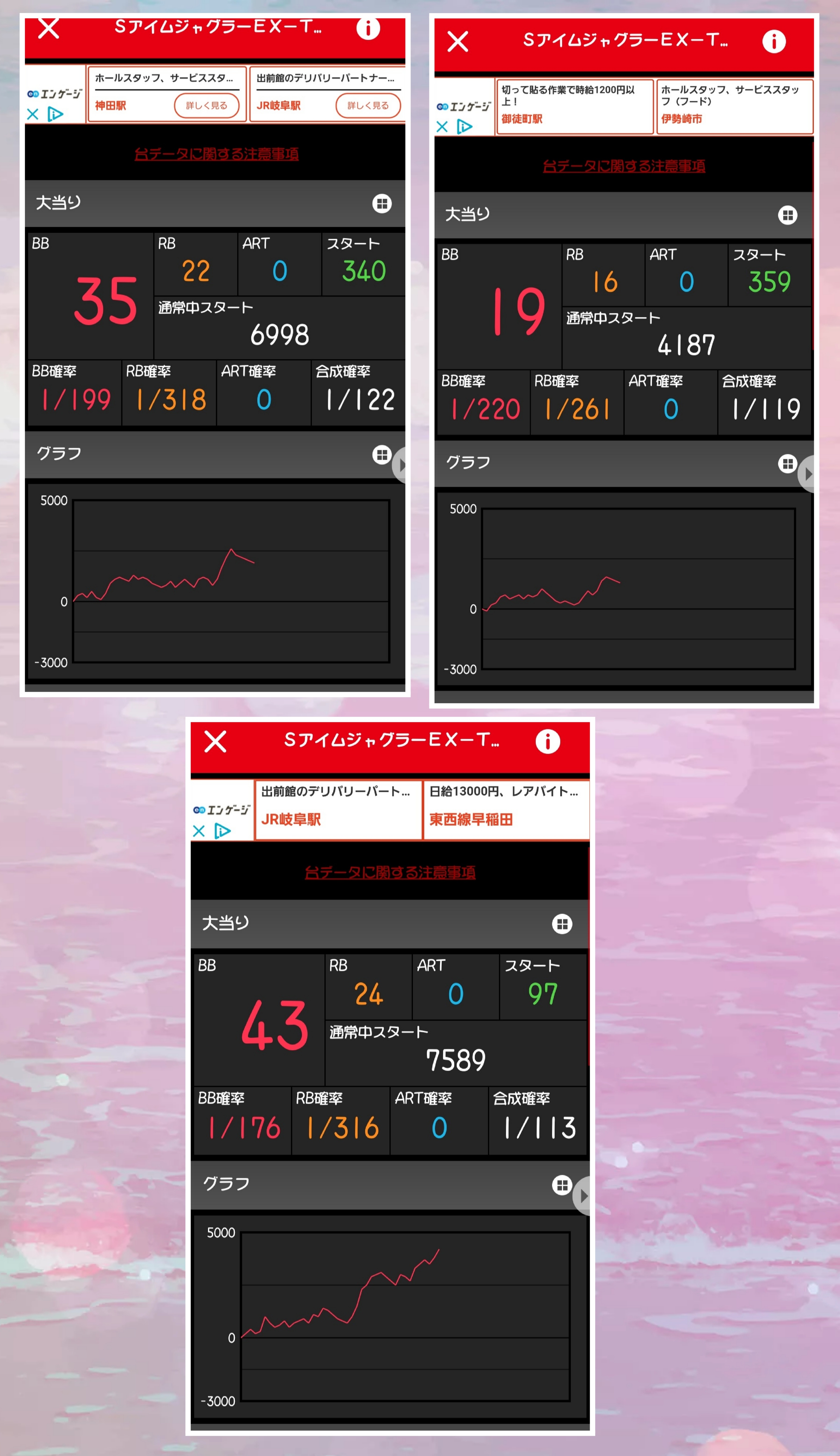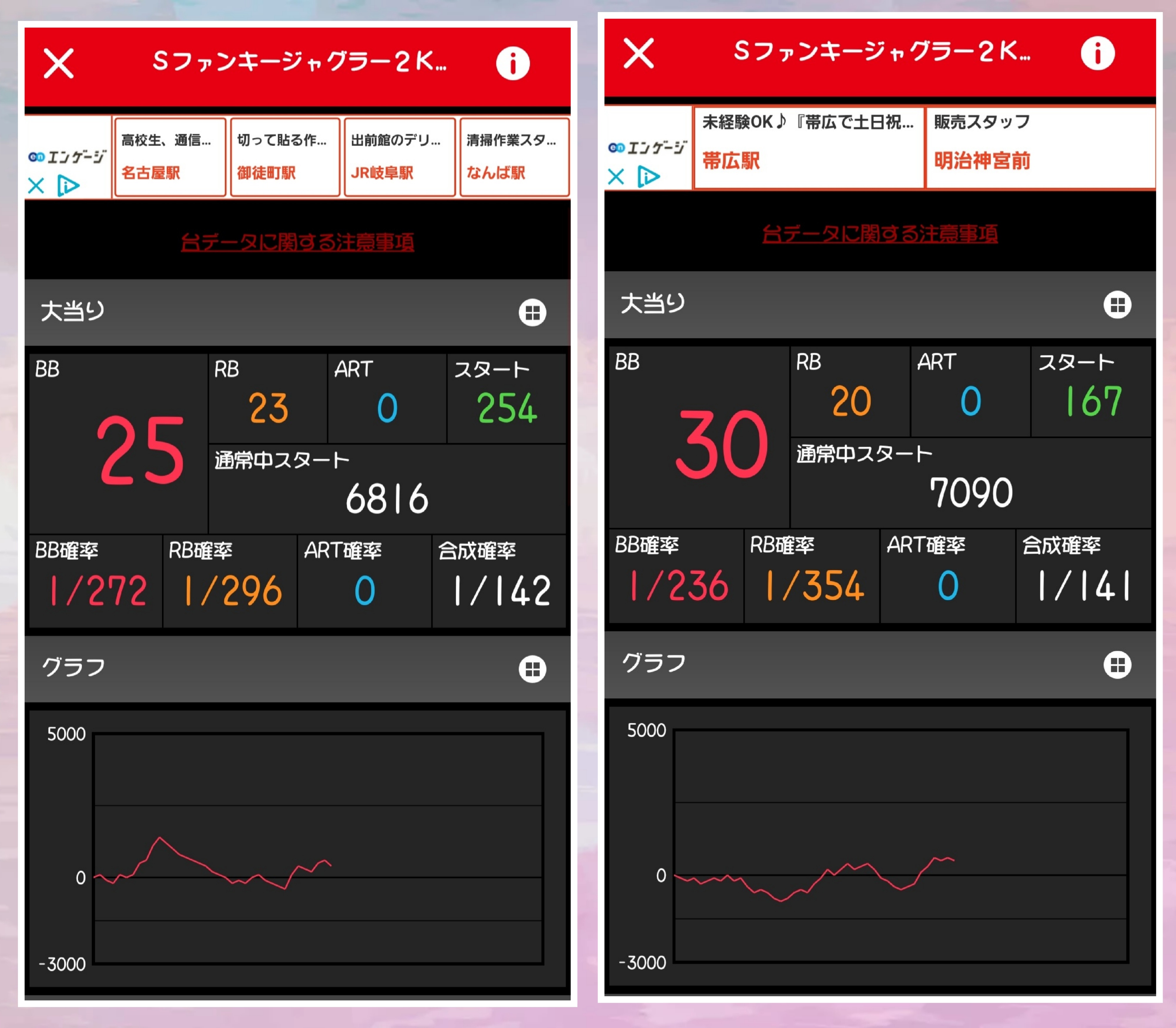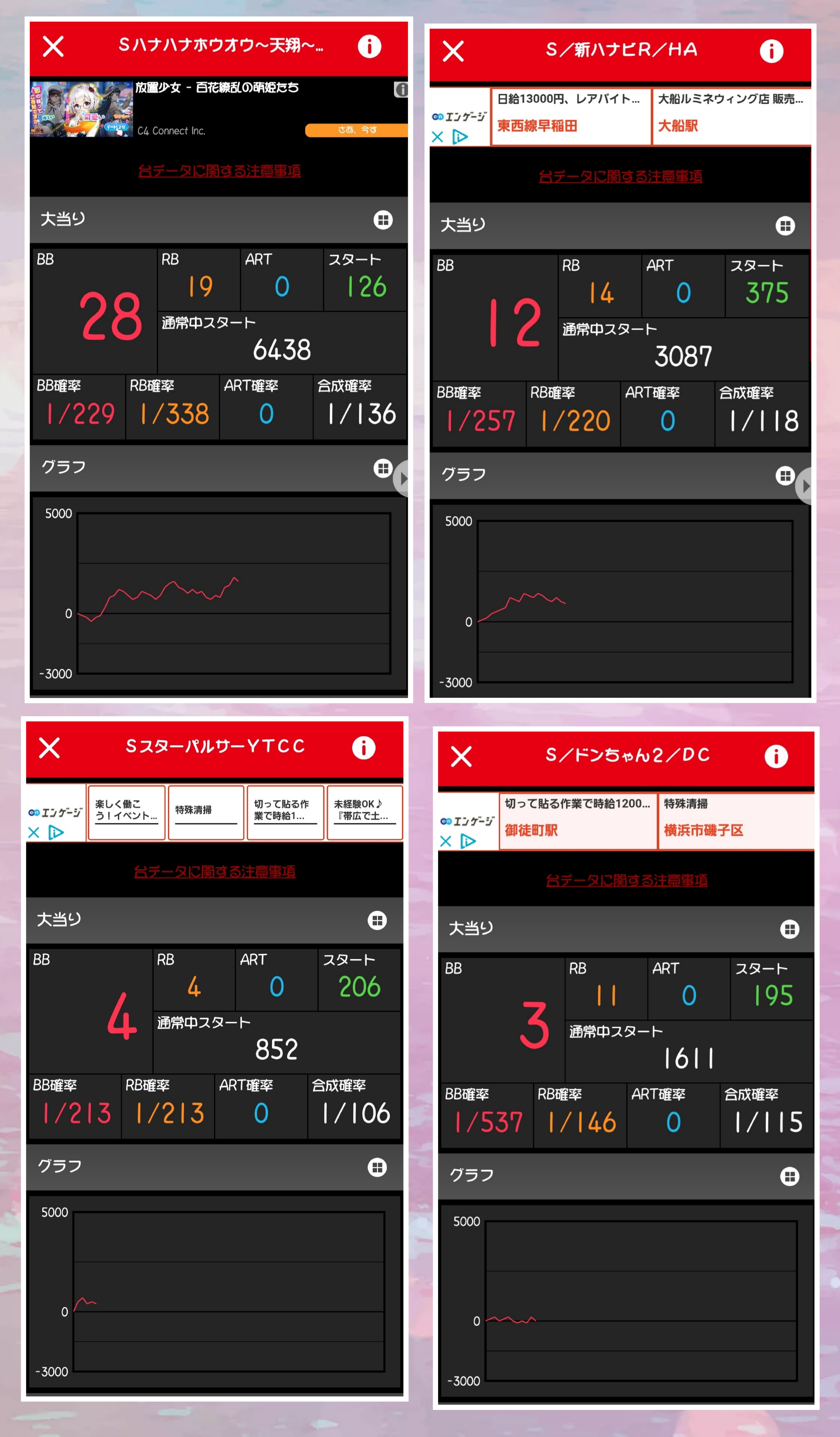 この3台は1回や2回のハマりはあったものの初当たりは軽めで天国移行率がいい台もあり。グラフだけみるとちょっとキツめですが沖ドキは高設定でもこうなりますからね…。