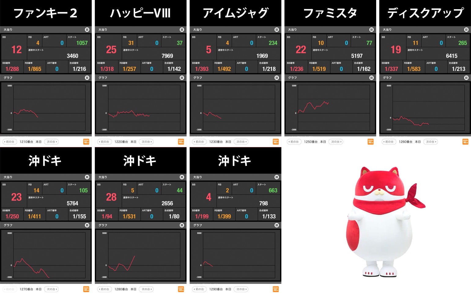 ピックアップ機種 平均pt数 平均ゲーム数 平均PAYOUT 機種名 プラス台数 1,512pt 9,197G 105.5% S押忍!番長ZERO 9/10 204pt 5,103G 101.3% スマスロ北斗の拳 44/90 101.2% 5,969G Sパチスロ甲鉄城のカバネリ 20/44 ポイントTOP5