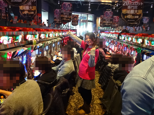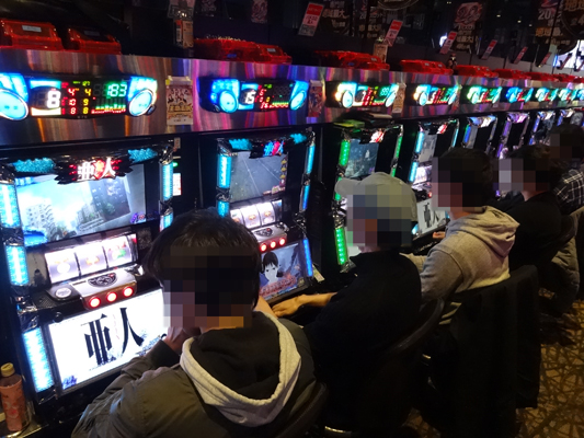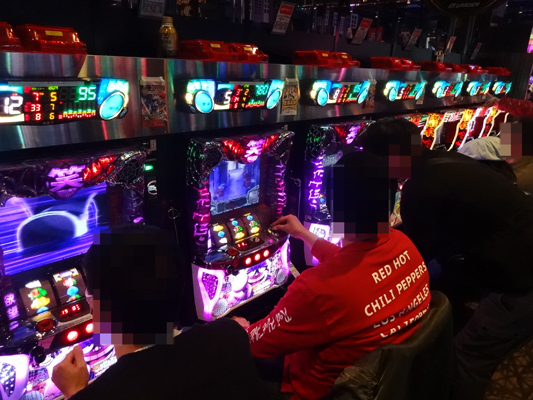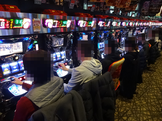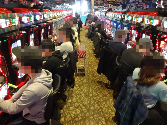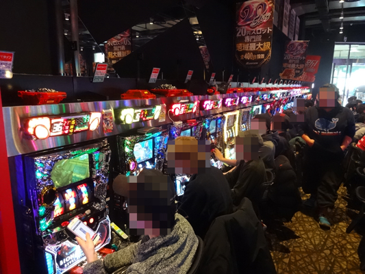 当日はお昼12時頃に突撃!! 店内に入ってまず印象的だったのが、とても混み合っていて、空き台を探すのが大変な状況だったこと。『ミリオンゴッド-神々の凱旋-』、『アナザーゴッドハーデス-奪われたZEUSver.-』、『押忍!番長3』など設置台数がかなり多いところも全く空き台がありません。どうやら朝イチの時点で、かなりのお客さんがいたみたい。