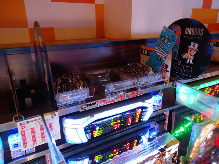 ●『パチスロ エウレカセブンAO(2台設置)』…こちらは、1台が1箱、残りのもう1台が下皿のコインのみで、出玉感はありませんでした。ただ、そんな状況なのに打っている方がブン回していたんですよね。何かの設定示唆が出たのでは? そう思いましたよ。