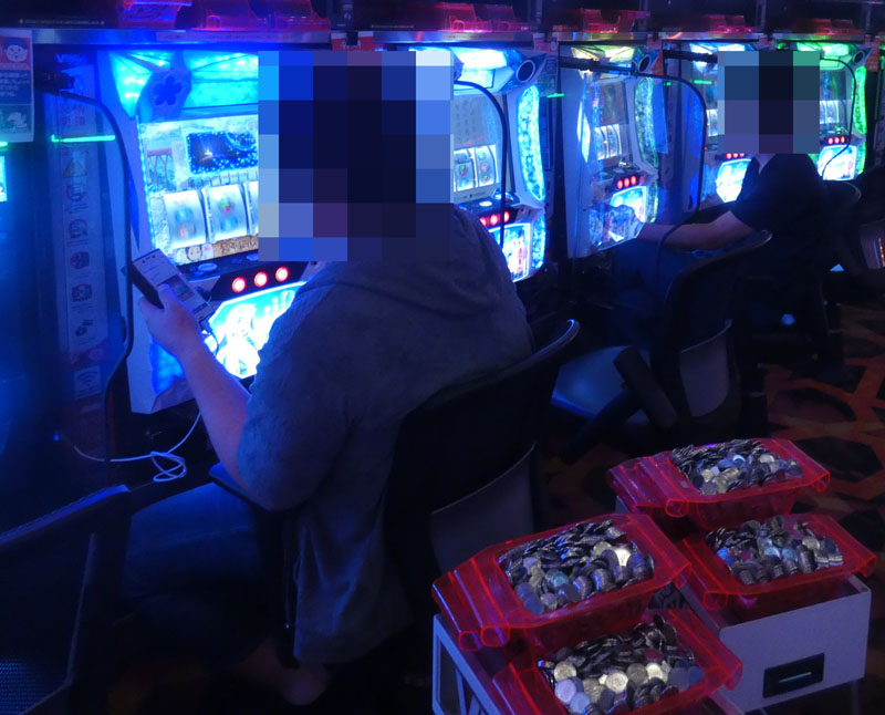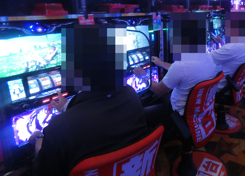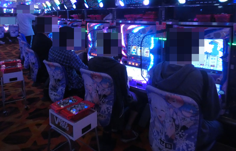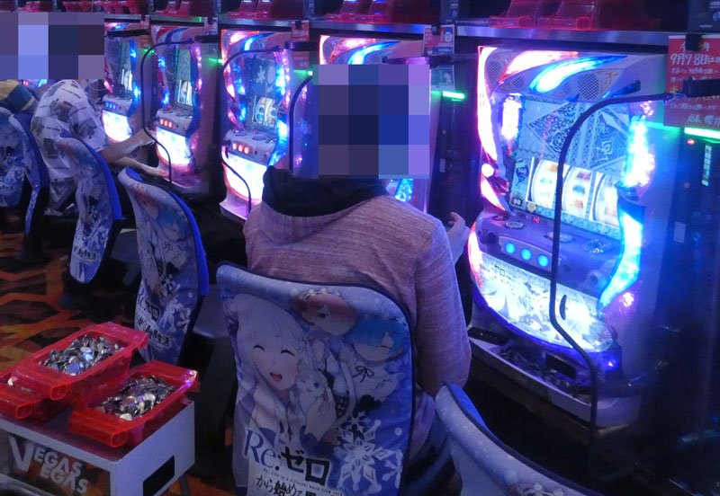 真っ先に目に飛び込んできたのは『まどか☆マギカ』シリーズ。新台の『まどか☆マギカ新編』では複数の台が1〜2箱のptを抱えて稼働中! さらには『2』でも別積みが複数台確認できるなどシリーズ全体で盛り上がりを見せていました。その次に目立っていたのは『Re:ゼロ』。こちらも『まどか☆マギカ』に負けず劣らずの好状況で、取材時点で2〜3箱のpt台を抱えており、データ的にもかなり優秀でした。