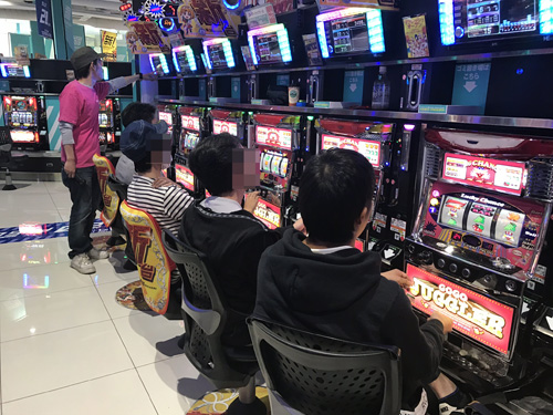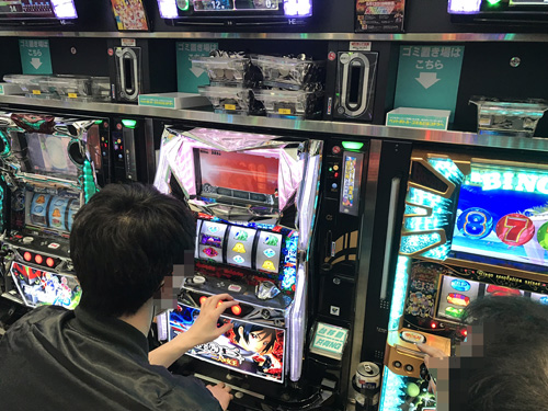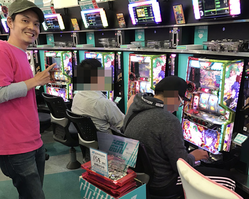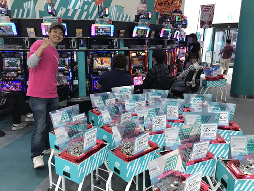 18時頃に店内に入ると、すぐに出玉で気づきました。当取材はいつも、機種単位で盛り上がっているコーナーが複数あるのですが、『バジリスク絆』からは、その匂いがプンプンしたんですよね。10箱以上も別積みしている方を筆頭に、多くの方が出玉を積み上げていたんです。