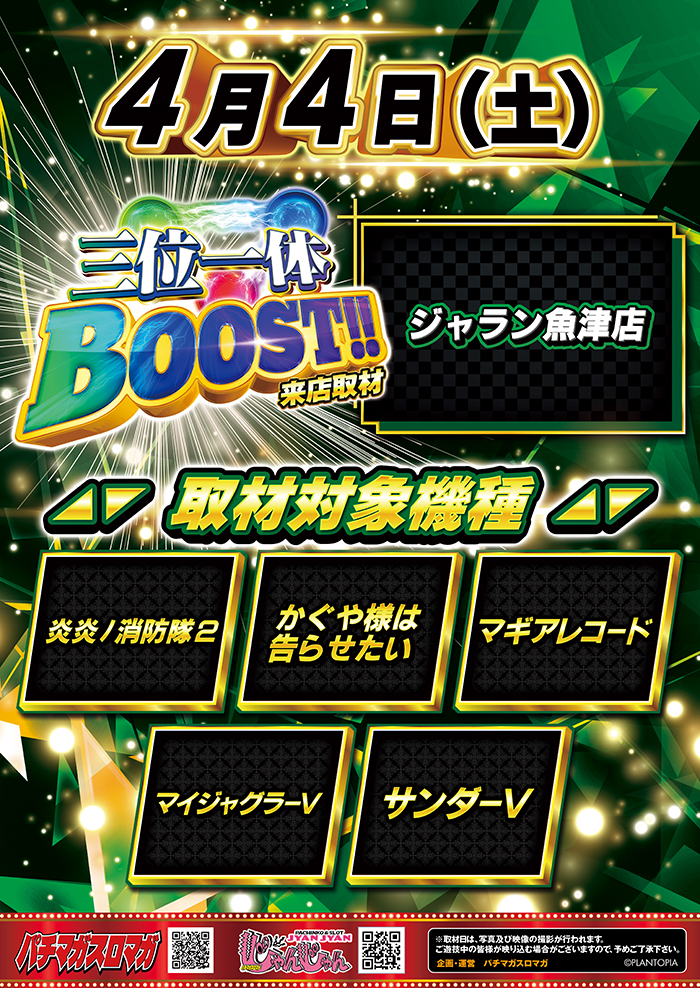 住所 富山県魚津市江口420-1 アクセス 魚津インターより車で5分。国道8号線沿い サイトURL http://49540.p-world.jp 営業時間 9:00〜23:00 入場ルール 08:35 参加券配布予定