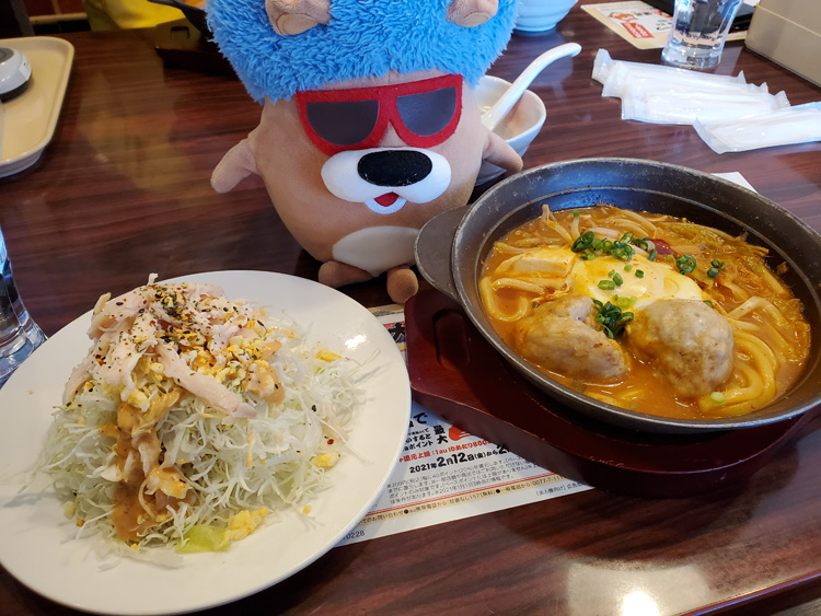 昼食は「サラダ」と「チゲうどん」。この日は風が強く寒かったのでチゲうどんの温かさが身に染みました。辛さも丁度よく、とても美味しかったです。…と本来ならここでご飯タイムは終わりのはずでしたが、なんと店舗前に移動販売が来ているではありませんか!! どうやら地域一丸となり頑張ろうといった企画らしいので、食べない訳にはいかないと「味たまうどん」を注文。昼食にうどんを食べたばかりなのに、ツルッと食べられちゃうくらい美味しかったです。皆様も見かけたら食べてみてくださいね♪