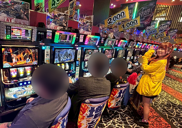毎回あまり抽選がよろしくない我々ですが…今回も二人とも後方よりの番号でした(笑)。実戦当日は私の誕生日だったので好きな台を打とうと決めていて、朝イチはモンスターハンターライズからスタート。前回来た時と設置場所が変わって入口に近い場所になっていました。