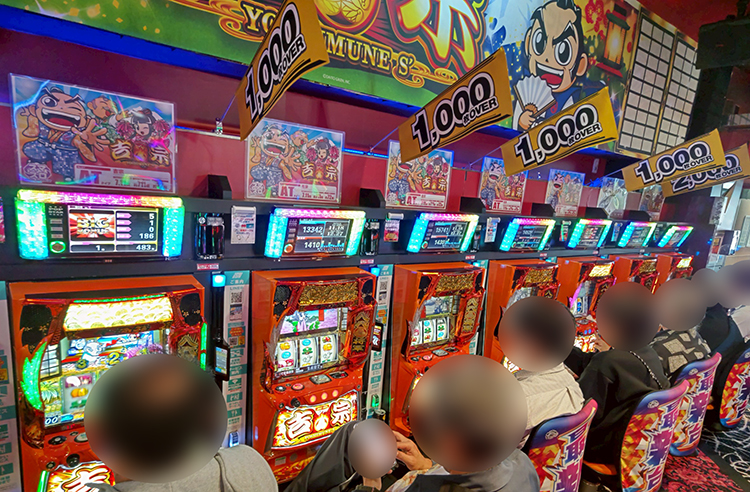 「マギレコ」「アイマス」「麻雀物語」も空きなし。「吉宗」は入れ替わりはありつつも、高設定示唆やモード移行が良さそうな台も。そんな中で私は、朝イチはBIGを引けて711枚楽しいーとまったり遊んでいたのですが、午後になって天井からのREG連で撃沈してしまいました。左右の台はどちらも9000枚オーバーしていたのにな。他にも「SBJ」や「かぐや様」からも挙動が良いとの声を聞けました。