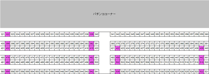 ご覧の通り、タテの並び(末尾的には2と9)で好調台が出現!! これまでとはちょっと違う法則ですが、今後のためにタテとヨコの両方を意識した方がいいですね!【法則】タテの並びが出現!台番号 機種名 pt数 339 S南国育ちA5−30 1,004pt 399 ハナビBHS2 376pt 402 SLOT魔法少女まどか☆マギカ2/MM 6,118pt 422 S/甲賀忍法帖/LL 2,786pt 442 SLOTバジリスクIIIBE 5,711pt 459 S/甲賀忍法帖/LL 1,646pt 479 S/劇場版まどか/KK 2,489pt 482 ファンキージャグラー/KK 812pt 499 ニューアイムジャグラーEX−KA 931pt 502 マイジャグラー3KD 864pt 519 ゴーゴージャグラーKK 676pt 559 SアイムジャグラーEX−TP 489pt ※数値等はパチマガスロマガスタッフが独自に調査したものです。その他の取材結果
