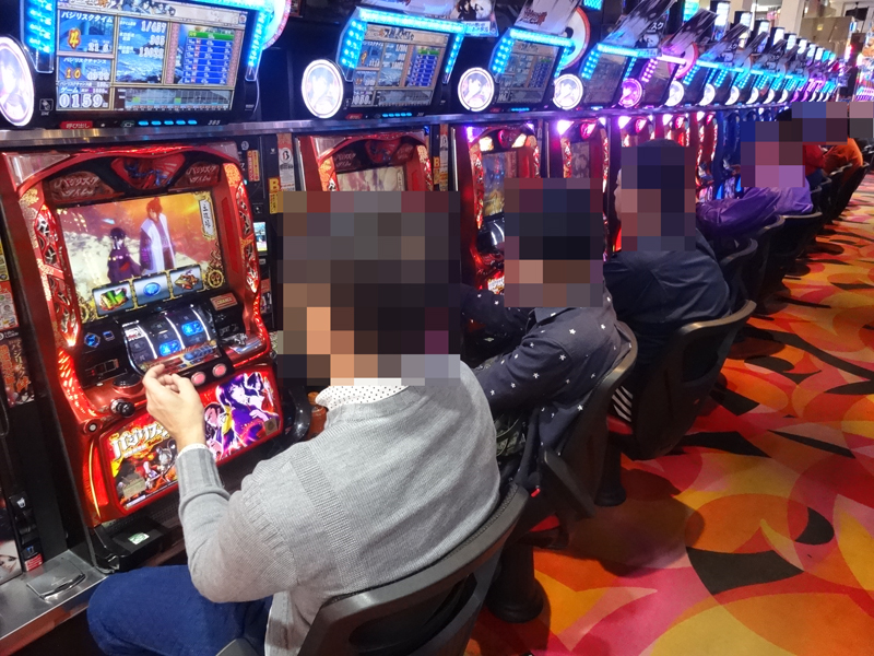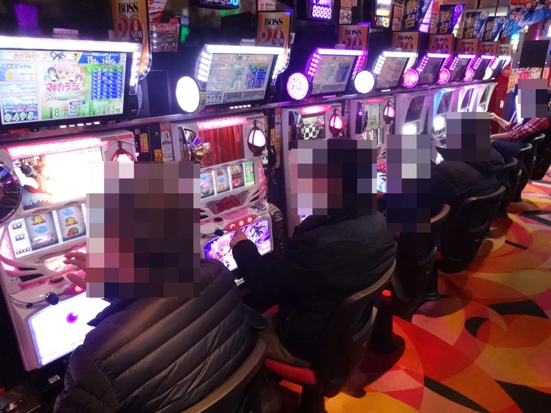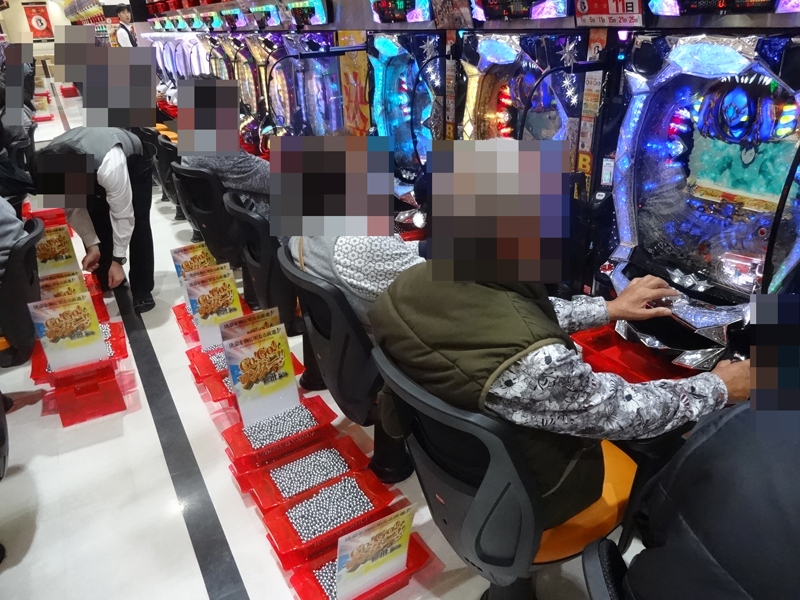 『バジリスク絆』からは一撃ではなくコンスタントに出玉を伸ばしている方々がシマの各所に。自信をもってブン回している方もいたので、この2機種はまずインパクト大でした!