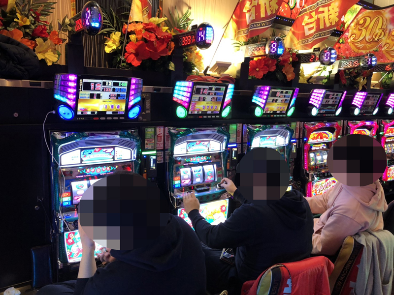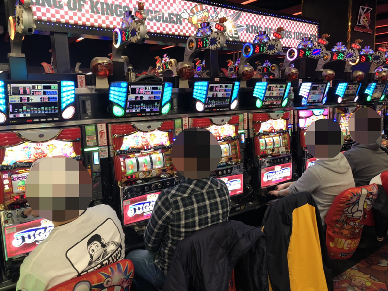 そして店内はやはり『ジャグラー』系が早くもアツげな感触。さっそくブン回し態勢にに入っている皆さんも……これは本日注目のシマ間違いなし!
