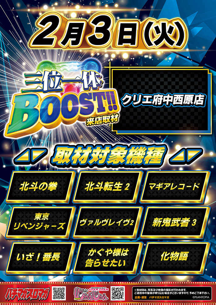 2026/2/3(火)【三位一体BOOST!!】取材対象機種(9機種)のうち、特に盛り上がっていたのは『北斗』『化物語』『ヴァルヴレイヴ2』の3機種!! 大量pt獲得台も複数出現!