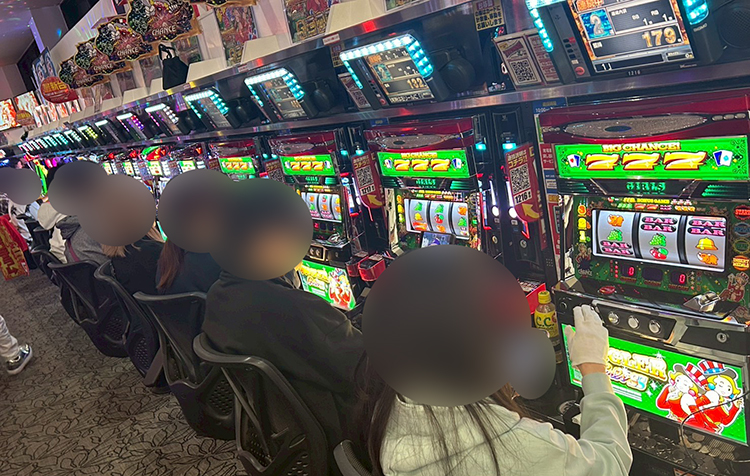 私も打っていたハッピージャグラー…のお隣に設置されている「ジャグラーガールズ」が、全台でボーナス合成が良好! きっと全台系だったと思います。すぐ近くで羨ましいなぁ〜と眺めていた私は、ハッピージャグラーのあとでやっと出始めた空き台の、ファンキージャグラーに移動して少しマイナス。あと数台ずれてるところに座ってたら、全台系機種できっとプラスだったんだけどなぁ。