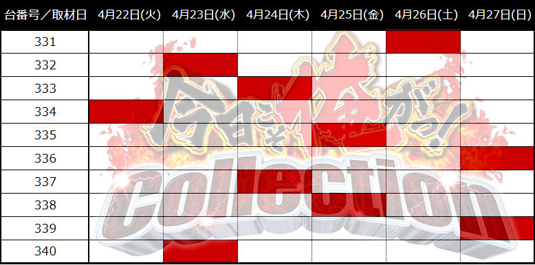 2025/04/22(火)〜2025/04/27(日) 順位 台番号 pt数 日付 1 337 4,738pt 4月27日(日) 2 333 3,763pt 4月23日(水) 3 339 3,121pt 4月26日(土) 4 333 2,826pt 4月24日(木) 5 340 2,018pt 4月24日(木) 6 332 1,811pt 4月23日(水) 7 331 1,773pt 4月25日(金) 8 339 1,707pt 4月22日(火) 9 339 1,512pt 4月22日(火) 10 338 1,431pt 4月27日(日) ※数値はじゃんじゃん編集部が独自に調査したものです。その他の取材結果