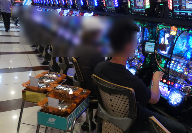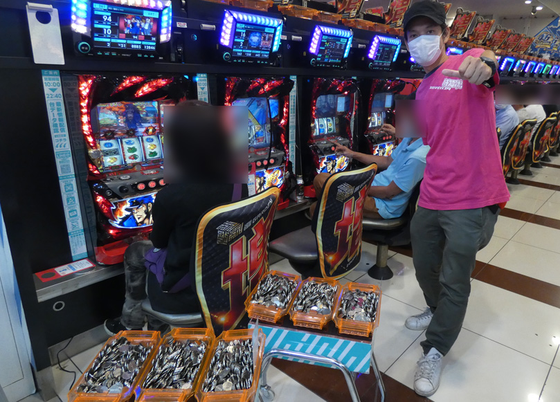 やっぱり! というわけで、重点的にこちらのコーナーを取材したのですが、他にも『HEY!鏡』や『マジカルハロウィン6』で別積みしている方がいましたし、『パチスロコードギアス反逆のルルーシュR2 C.C.ver』も出玉はそこまで付いてきていませんでしたが、がんがん回している方がいました。これらの機種が2台とも強い、とまでは感じませんでしたが、2台設置機種には優秀な台を複数使っているように見えましたよ。