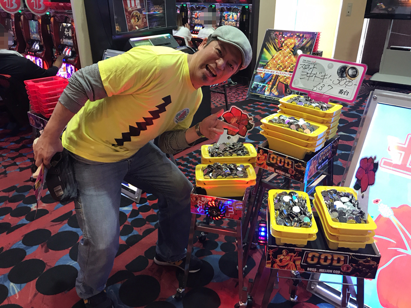 早速、ホールに入店すると、そこは南国かと見紛うほどの熱気でムンムン☆ さらに南国かと見紛うほどにチカチカと咲き乱れるハイビスカス(沖ドキ)の花々! そして、ホール全体を見回しても、その高稼働を裏付けするような満開のドル箱の数々♪ やはり、間違いない……この店、『本物』だ!