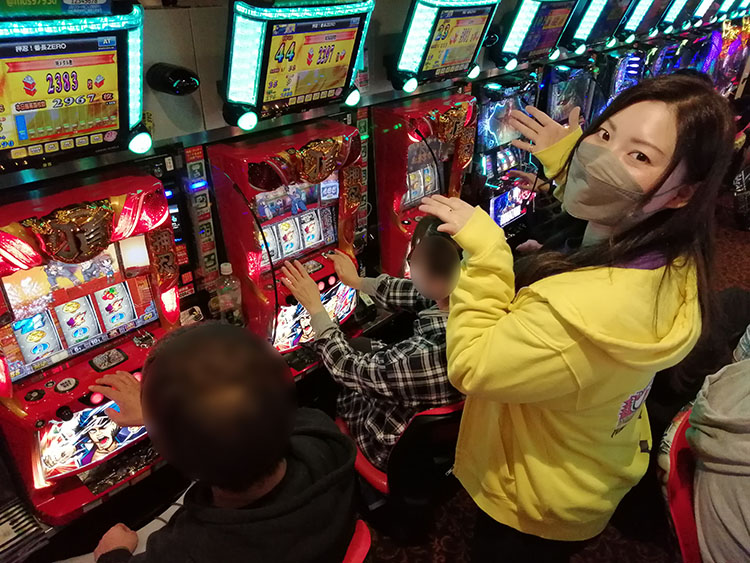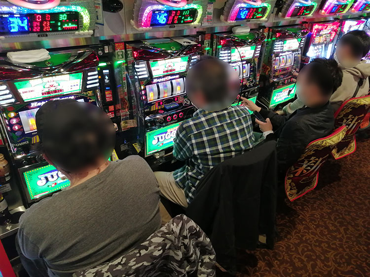 この日の抽選結果はなんと…最後尾!! 店内に入った時には新台のハッピージャグラーV3や番長ZERO、バジリスク絆2といった人気機種はもちろん埋まっていました。