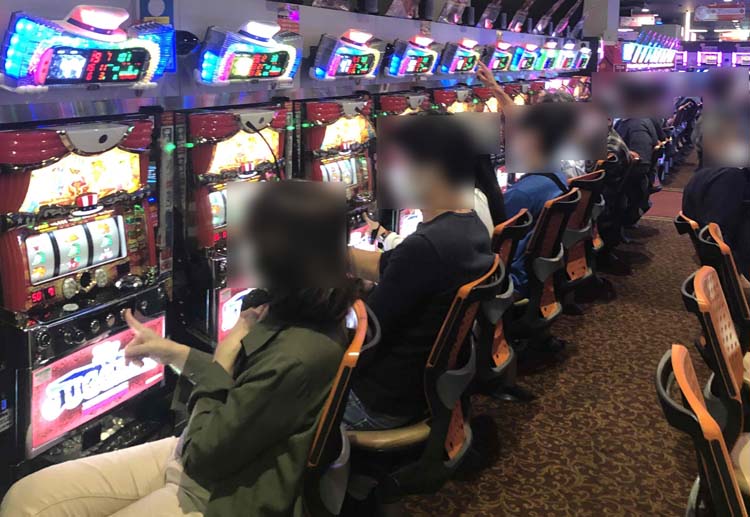王道の『マイジャグラーIV』を中心にジャグラーコーナーが大盛況! さらに下記データの写真を見ての通り、並んで好調台が出現するいつもの法則も確認しましたよ。