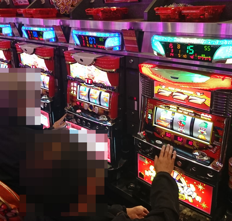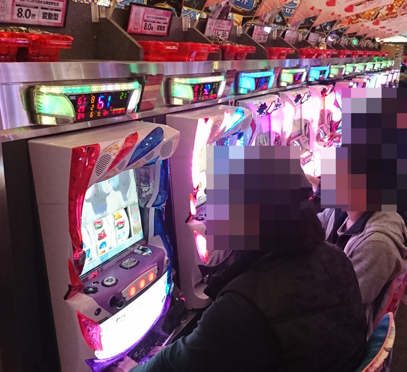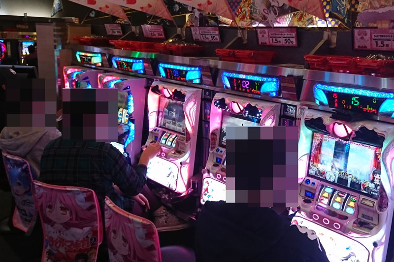 取材を始めて真っ先に目に飛び込んできたのが『まどマギ2』。設置は全3台と決して多くないものの、そのうちの2台がすでに2000ptオーバーの好調っぷり。残りの1台もデータを見る限り伸びそうな気配で、明らかな好状況でした。当然のことながら最終的には3台すべてがプラス域という好結果に!!そしてその次に気になったのが萌えスロコーナー! 機種・台数ともにバラエティ豊かなだけでなく、人気の方も上々。さらにptも『Re:ゼロ』で2000ptオーバー、サクラ大戦では3000ptオーバーと好調でした!!