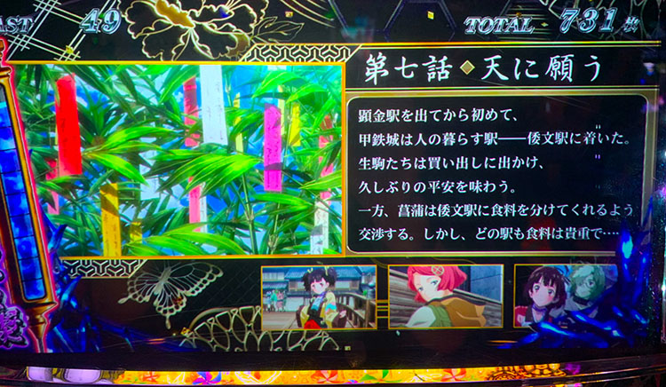 結果的には序盤から良挙動。大きな凹みなく取材終了まで楽しむ事が出来ました。最後の最後に設定4以上確定となるカバネリボーナス中の「七話」も出現。