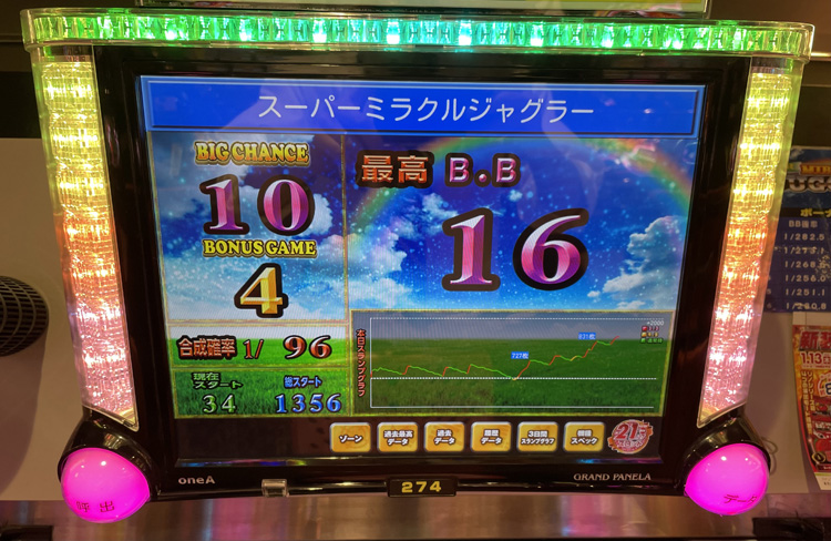 順位 機種名 pt数 1 マイジャグV 2,779pt 2 ファンキー2 1,451pt 3 ファンキー 1,398pt 4 ミラクル 1,338pt 5 ファンキー 1,333pt ※数値はじゃんじゃん編集部が独自に調査したものです。その他の取材結果