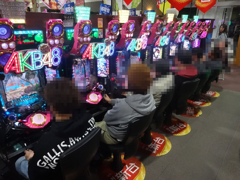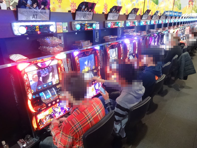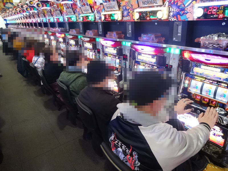 この日もっとも注目したのが複数の機種を取り揃えている『ジャグラー』コーナー。もっとも設置台数の多い『アイムジャグラーEX-AE』だけでなく、あらゆる台に1000〜2000ptの台が確認できる状況。当然のことながら各台ともほぼフル稼働で盛り上がっていました。