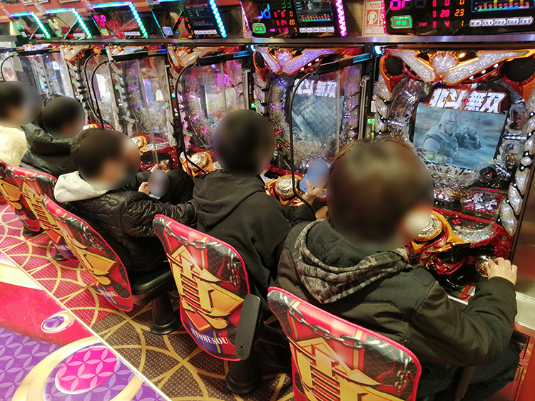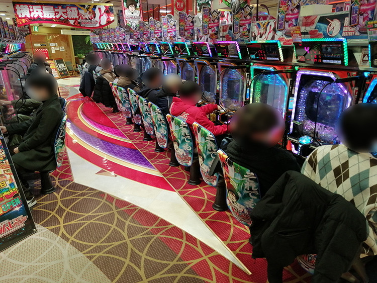 他には私がラスト1台に滑り込んだ「アズールレーン」。「エヴァ未来への咆哮」「リゼロ鬼がかり」「大海物語4スペシャル」などの台数多めなところも、お昼過ぎくらいにはしっかり人がついていました。