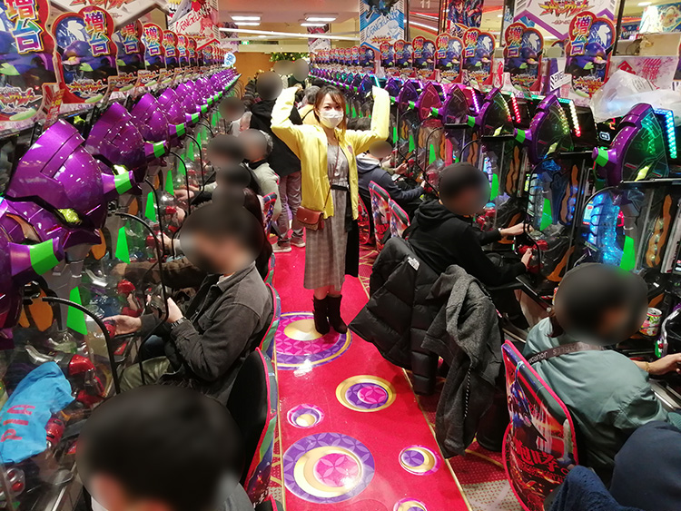 私は新台のゴジラ対エヴァンゲリオンにて実戦スタート。2島丸々と台数多めの機種だったのですが、開店からしばらくするとほぼ空き台がない状態に!