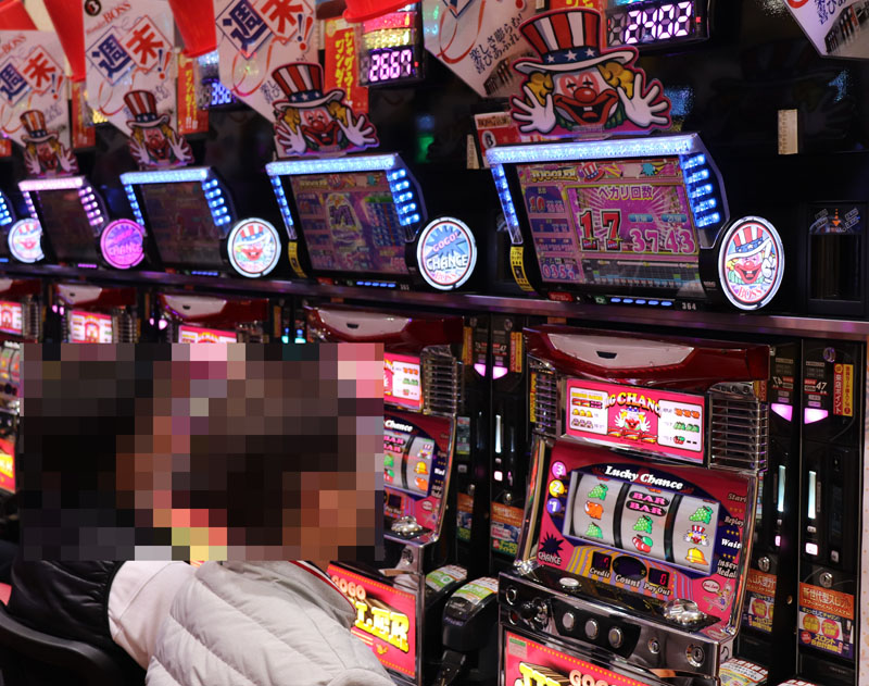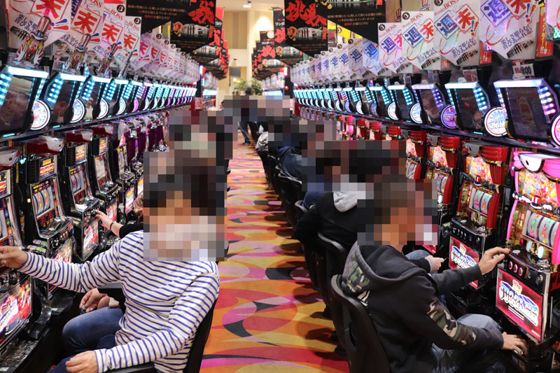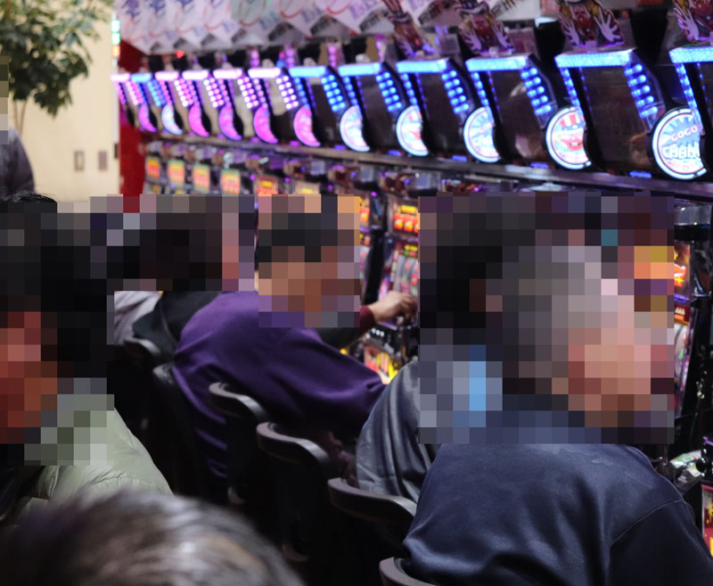 取材を始めたのは15時前。当然注目する機種は同ホールでは定番にして好状況連発中の『ジャグラー』コーナー。今回も期待度は激高!!と、取材をはじめてすぐに合算1/100を切る超優秀台をなんと2台も発見。総ゲーム数もこの段階で約3000回転と好調台間違いなしでした。もちろん他の機種も含めて全体的に稼働は非常に高く、ptを抱えているファンの方も多数見受けられました。