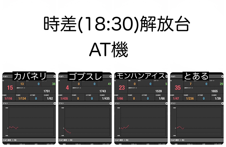 ちなみに自分が打ったスマスロ北斗はこの末尾対象でもないのに設定6が確定しておりまして。つまりは対象末尾とは関係ないところにも高設定が至るとことに存在していたんですよね。そんな訳で特に強かった機種をいくつかピックアップ!ピックアップ機種 平均pt数 平均ゲーム数 平均PAYOUT 機種名 プラス台数 725pt 6,746G 103.6% Lパチスロ北斗の拳AD XR 44/90 585pt 6,567G 103.0% SマイジャグラーV KD 47/71 315pt 6,968G 101.5% Sパチスロ甲鉄城のカバネリZR 23/43 285pt 6,604G 101.4% L革命機ヴァルヴレイヴD 9/23 2,275pt 6,276G 112.1% L 主役は銭形4 L1 8/12 ポイントTOP5順位 機種名(台番号) pt数 1 L主役は銭形4L1(1018) 18,042pt 2 L革命機ヴァルヴレイヴD(925) 14,517pt 3 L パチスロ北斗の拳AD XR(1094) 13,855pt 4 L革命機ヴァルヴレイヴD(918) 10,835pt 5 L パチスロ北斗の拳AD XR(879) 9,652pt 更にこの日は18:30から打てる「時差開放台」も存在しておりまして。短時間しか打てないながらしっかりと反応していたので、そのグラフも全台ご紹介!