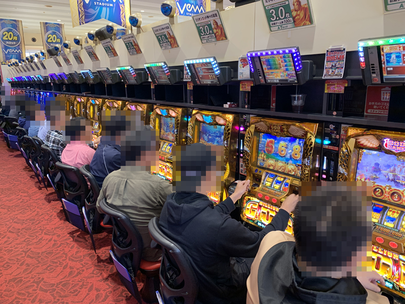 取材当日はあいにくの雨模様、朝イチの並びは控えめ……と思ったら甘かった。開店と同時に多くのファンが集まり熱気いっぱいの開店&稼働スタート! 特に『ミリオンゴッド凱旋』が人気抜群!