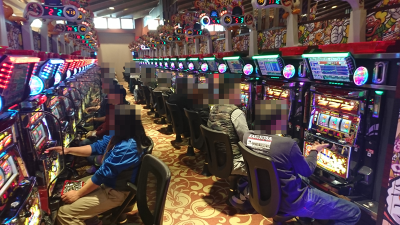 『沖ドキ!』コーナーからは昼すぎの取材の時点で既に別積みしていた台もあり、話しを伺ってみたところ『一撃で5000枚出た〜!』って嬉しそうな方もいらっしゃいました。『バジリスク絆』もかなり人気でほとんど空き台がなかったです。