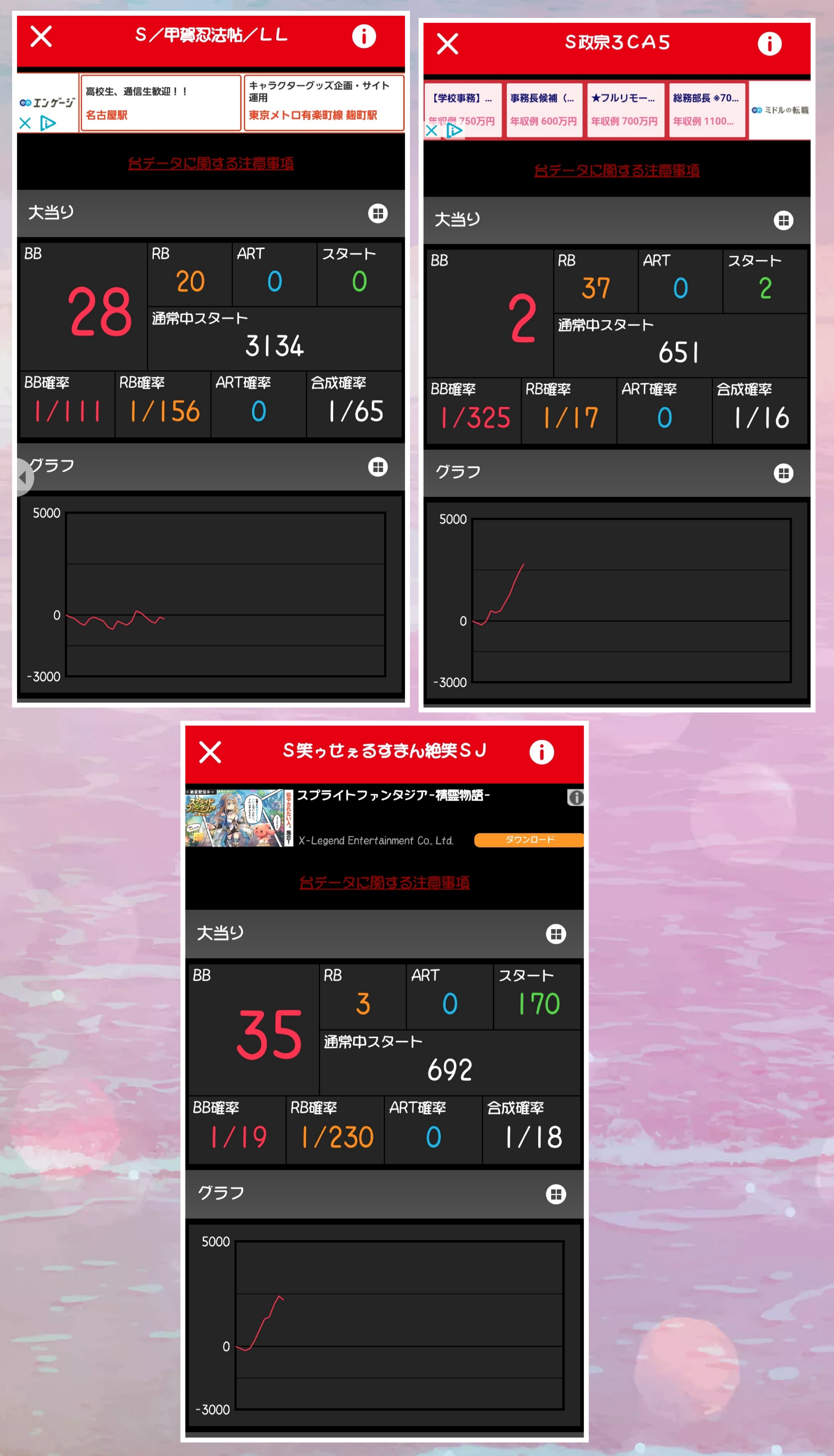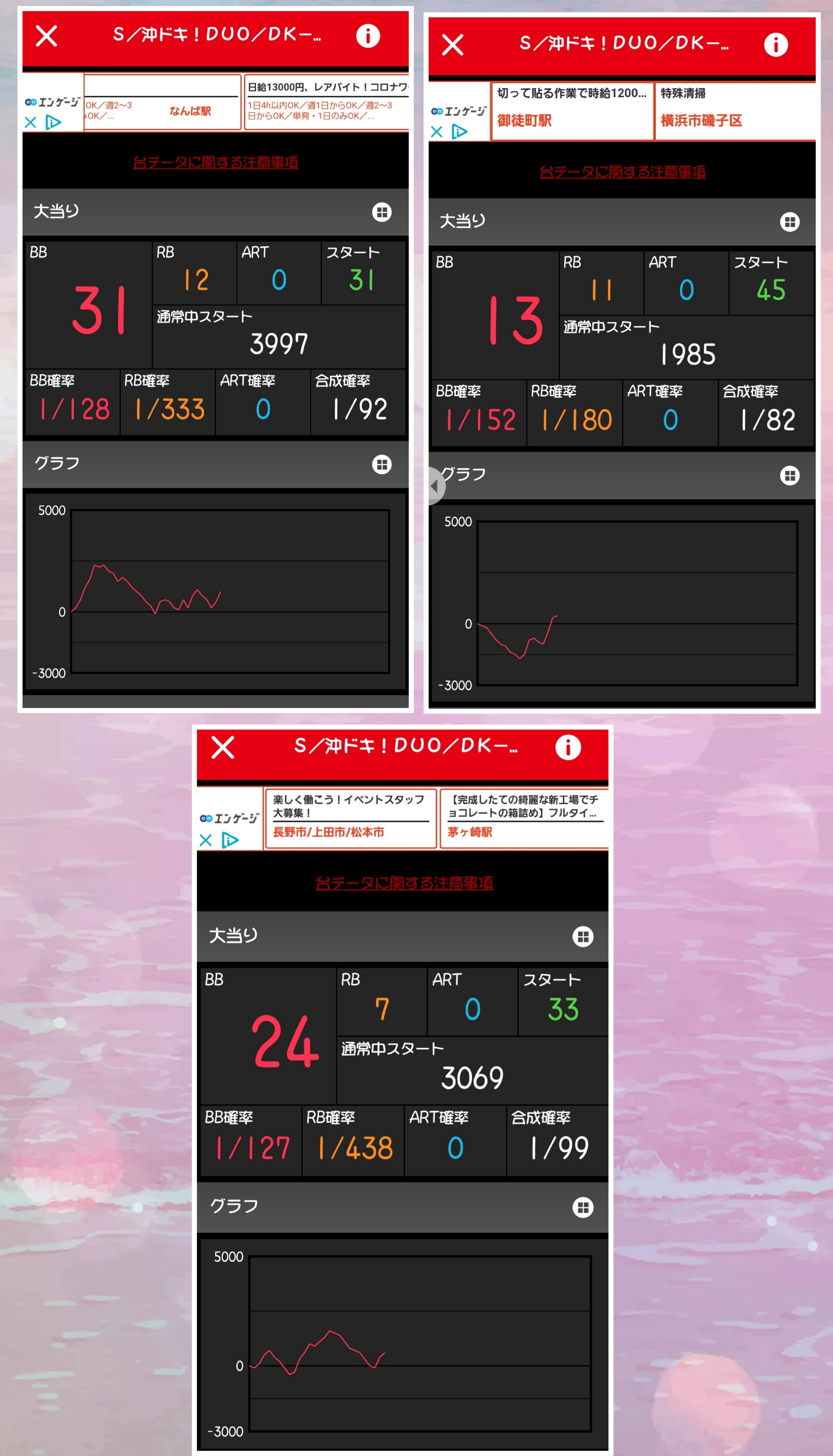 この3台は1回や2回のハマりはあったものの初当たりは軽めで天国移行率がいい台もあり。グラフだけみるとちょっとキツめですが沖ドキは高設定でもこうなりますからね…。