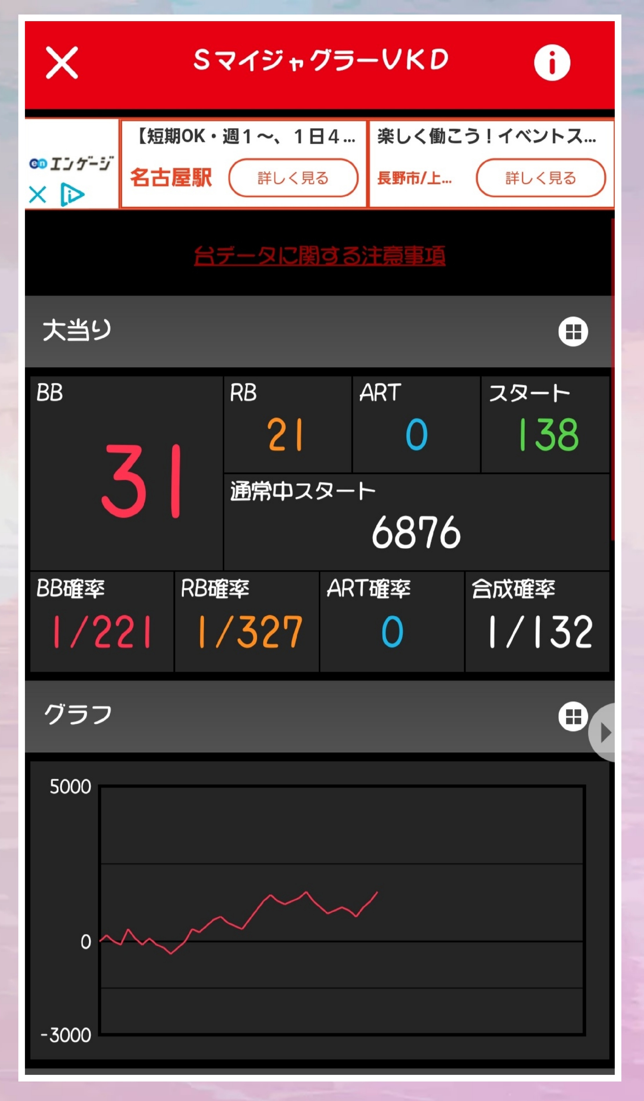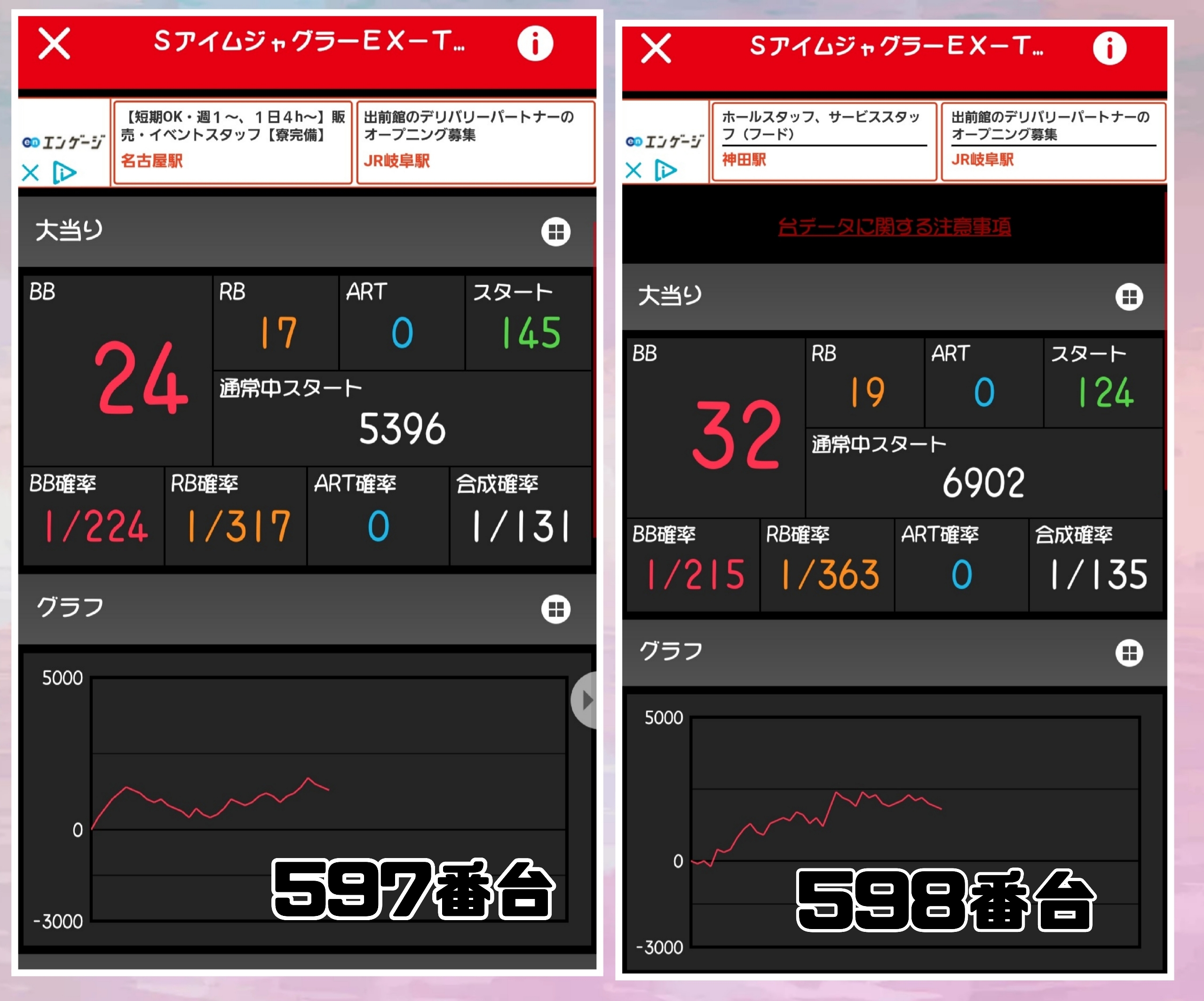 ホウオウと新ハナビはどちらとも合成が設定6以上の数値!!スターパルサーとドンちゃん2はあまり回っていませんがもしかしたら高設定の可能性もあると思いピックアップ。3台並びをピックアップ台番号 pt数 ゲーム数 機種名 PAYOUT 344 325pt 1,483G S/沖ドキ!DUO/DK−30 107.3% 345 328pt 1,626G S/沖ドキ!DUO/DK−30 106.7% 346 913pt 5,820G S/沖ドキ!DUO/DK−30 105.2% 352 1,100pt 3,275G SチバリヨZH−30 111.2% 353 -1,381pt 1,268G SチバリヨZH−30 63.7% 354 3,175pt 2,102G SチバリヨZH−30 150.3% 425 1,426pt 3,429G S押忍!番長ZERO PC1 113.9% 426 2,144pt 6,781G S押忍!番長ZERO PC1 110.5% 427 2,168pt 7,026G S押忍!番長ZERO PC1 110.3% 517 826pt 3,477G S/新ハナビR/HA 107.9% 518 -737pt 1,064G S/新ハナビR/HA 76.9% 519 644pt 1,916G S/新ハナビR/HA 111.2% 581 10pt 5,780G Sファンキージャグラー2KT 100.1% 582 2,634pt 8,111G Sファンキージャグラー2KT 110.8% 583 3,150pt 6,425G Sファンキージャグラー2KT 116.3% 591 206pt 4,855G SアイムジャグラーEX−TP 101.4% 592 807pt 6,295G SアイムジャグラーEX−TP 104.3% 593 159pt 3,990G SアイムジャグラーEX−TP 101.3% 594 1,808pt 7,607G SアイムジャグラーEX−TP 107.9% 595 -448pt 3,676G SアイムジャグラーEX−TP 95.9% 596 544pt 7,433G SアイムジャグラーEX−TP 102.4% 597 1,259pt 5,825G SアイムジャグラーEX−TP 107.2% 598 1,749pt 7,456G SアイムジャグラーEX−TP 107.8% 599 -220pt 5,926G SアイムジャグラーEX−TP 98.8% ガチマル!まとめ