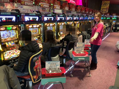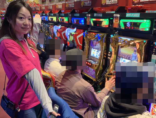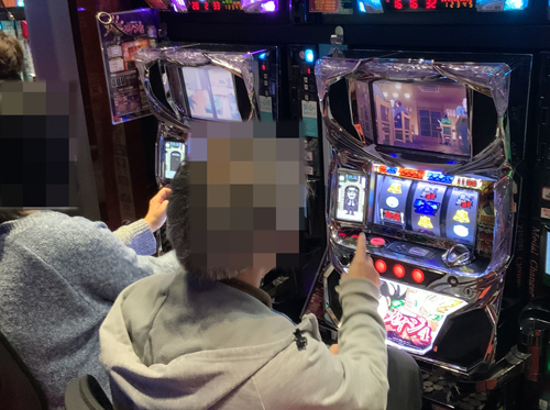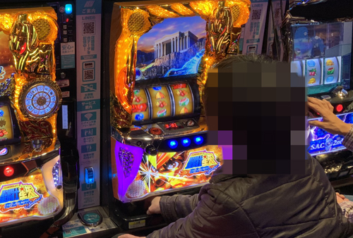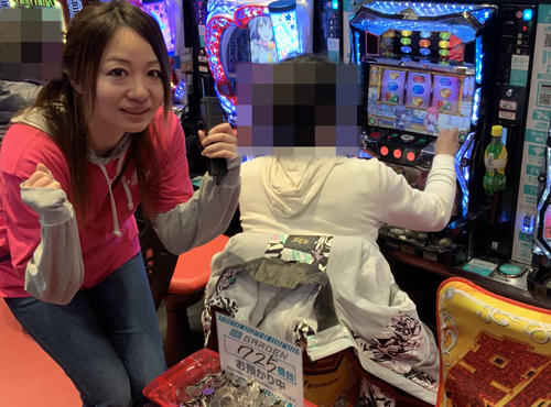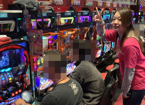 このお店はスロットコーナーに入るとすぐに、『ミリオンゴッド‐神々の凱旋‐』が一直線に奥までずらっと並んでいて、それだけで圧倒されます。ここがさらに増台をしたようで、まさに看板機種と言った貫禄がありました! やはりここには力が入っているようで、後ろで取材をしているとあれこれいろんなことが起こって、実況をマイクで追えないくらい。