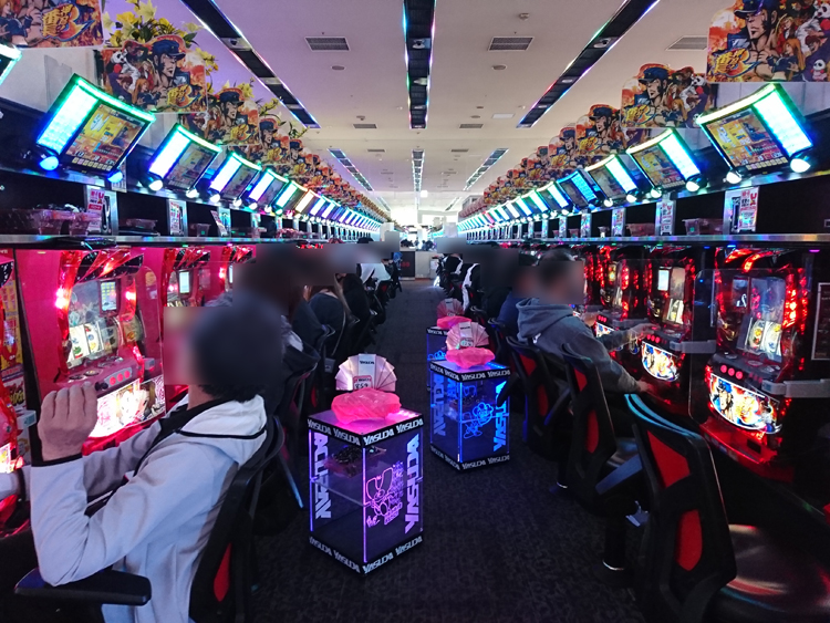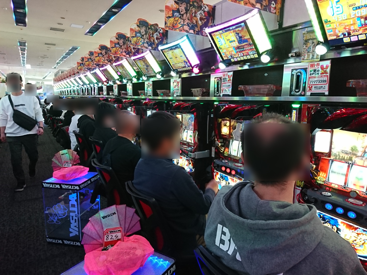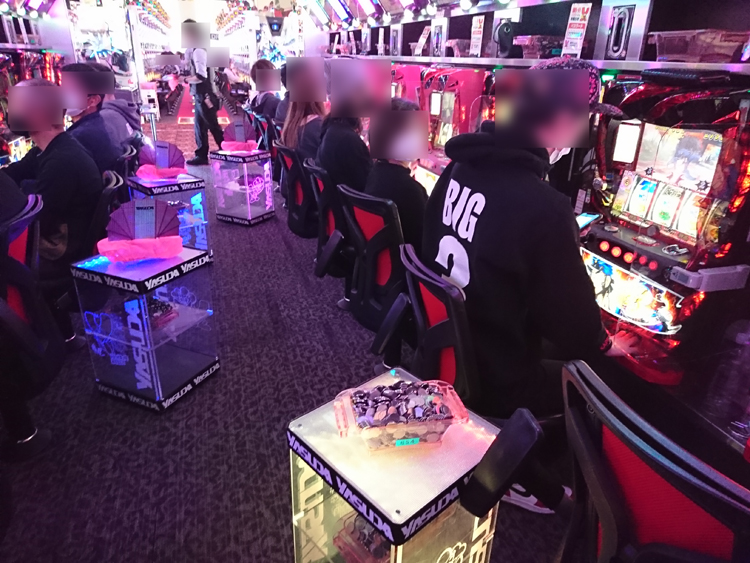 漢気機種『番長3』が大盛況! 取材中、2,500ptオーバーの台を打っていた人から「金閣寺出たよ」との報告を貰ったり、大半が箱を使用している&別積み複数出現していたりと好状況でした!