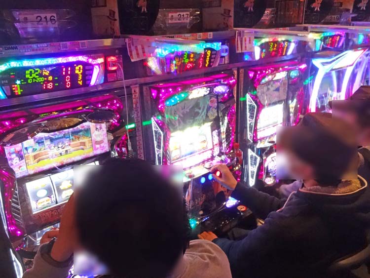 ちなみに常連さんに話を聞いたら、午前中に『Re:ゼロから始める異世界生活』で6確画面を見て、それでまず『Re:ゼロから始める異世界生活』がバーっと埋まったとのこと。で、その時に常連さんは『パチスロチェインクロニクル』を打っていて、「あれ、この台も良いのになあ」と思っていたら、時間が経つごとに、この列自体が強くなっていったようです。